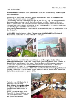 Den ASIA Rundbrief für das Jahr 2025 können Sie unter folgendem Link online als PDF aufrufen. Hierin wird der Jahresabschluss 2024 zusammengefasst, die laufenden Patenschaftsprojekte vorgestellt und auf die geleistete Soforthilfe aufgrund der Überschwemmungen in Nepal und in anderen Regionen eingegangen. Zudem freuen wir uns sehr, dass bei der Mitgliederversammlung im Juni Annette Roeckl in den Vorstand von ASIA Deutschland gewählt wurde. Gemeinsam werden wir uns weiter für Menschen im